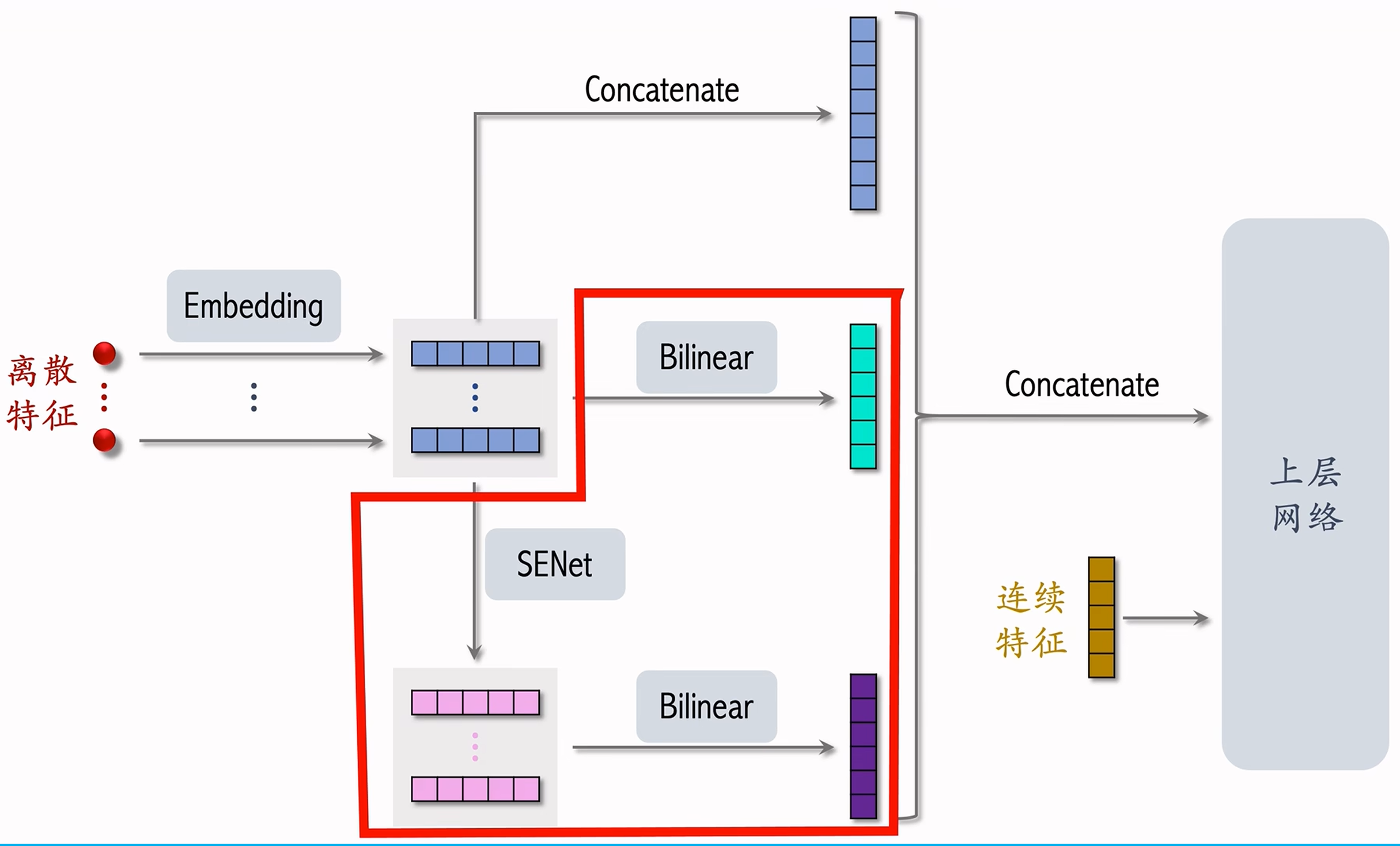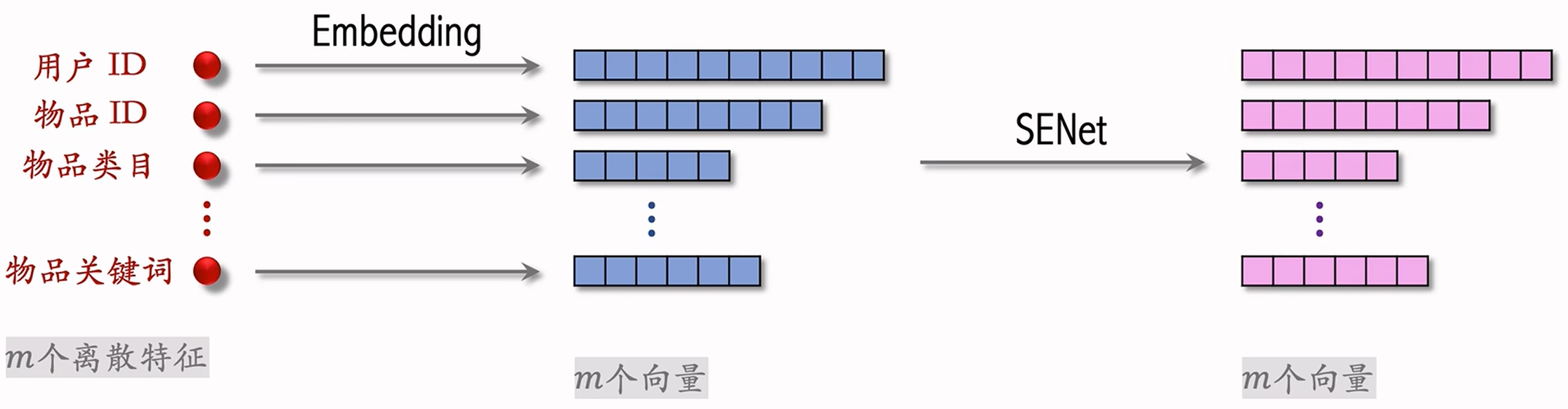 - SENet 对离散特征做 field-wise 加权,即SENet根据所有特征自动判断每个field重要程度;