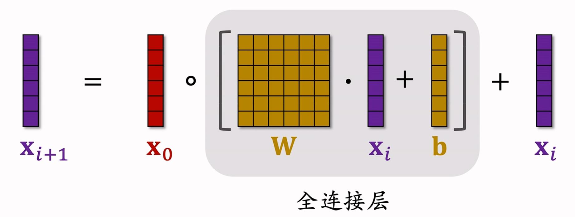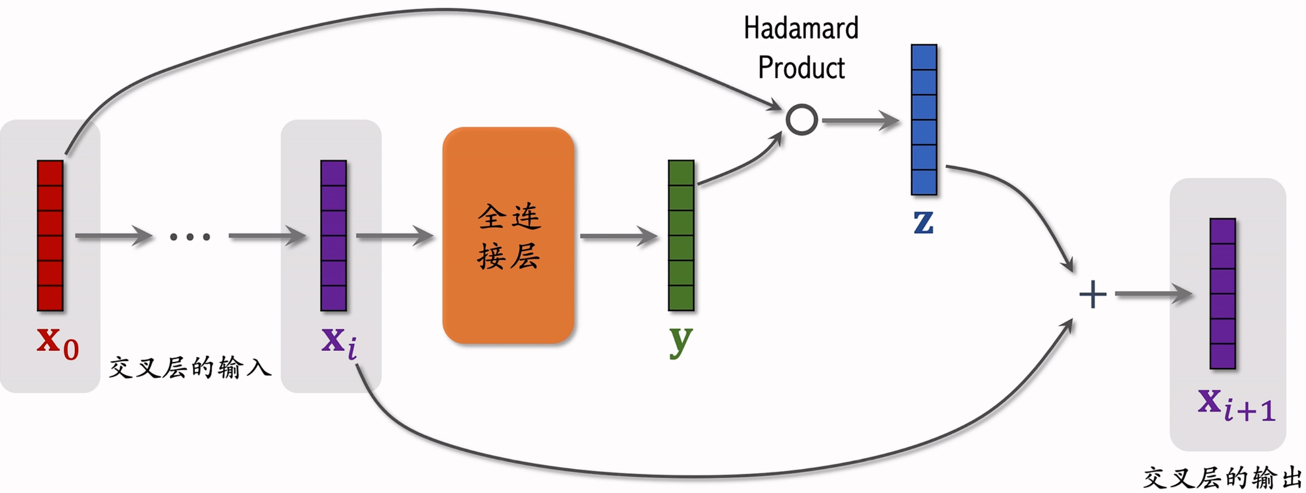 所以,交叉层的主要参数在所使用的全连接层中(训练过程中需要根据梯度更新),其他的求和与求 Hadamard 乘积的操作不涉及参数。故交叉层也可以写成公式: