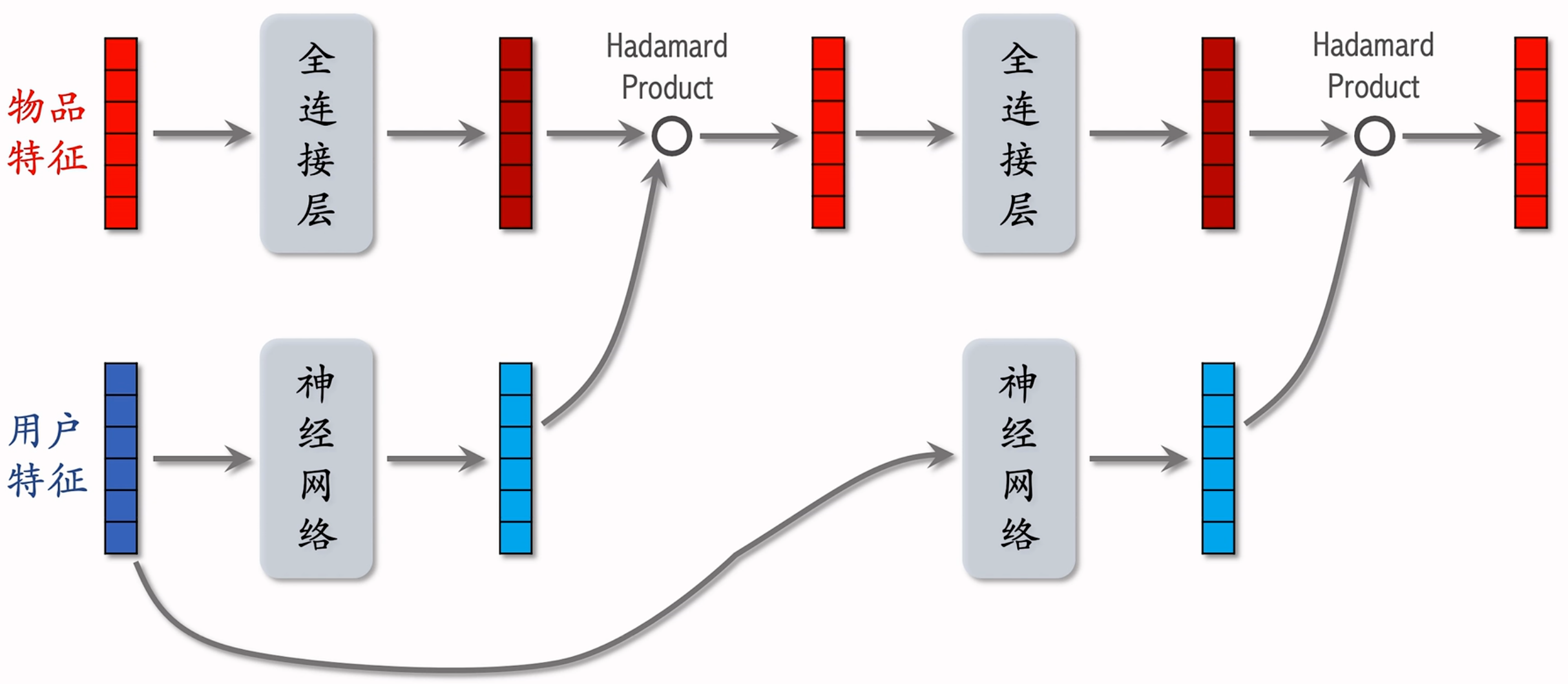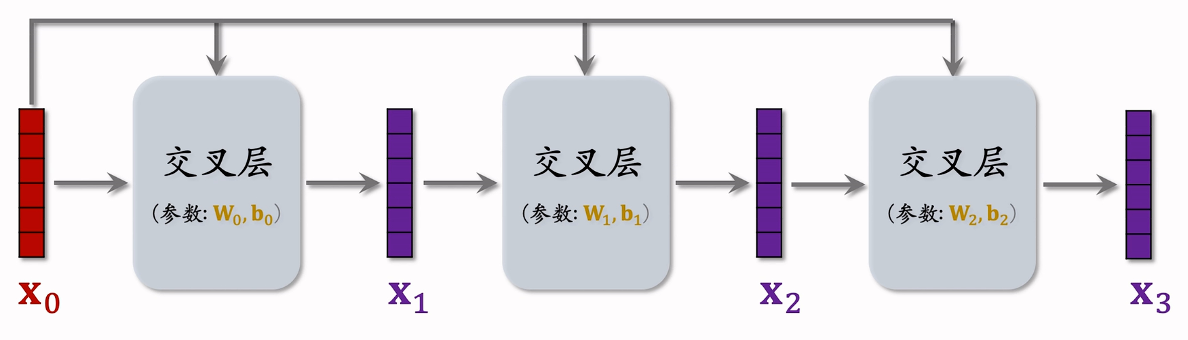 ,经过若干层神经网络后输出向量 ,这两个都是交叉层的输入; - 将向量