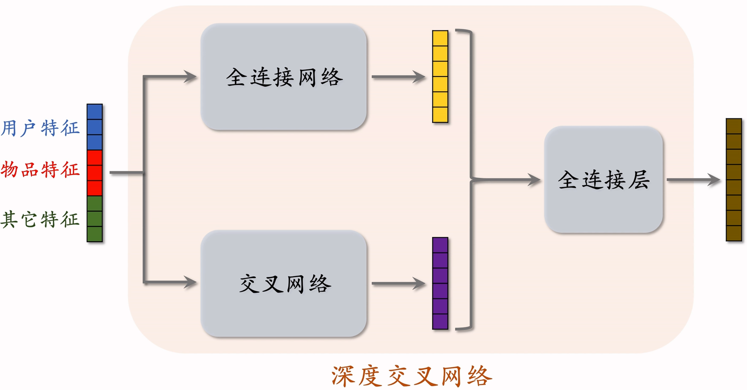 前序介绍地召回双塔模型、粗排三塔模型以及精排模型,它们应用的神经网络默认为简单的全连接网络,但也可以替换成本节将要介绍的深度交叉网络或者任何更好的网络架构,取得更好的召回或排序效果。总之,<mark style="background: #BBFABBA6;">DCN可以应用于召回或排序模型</mark>