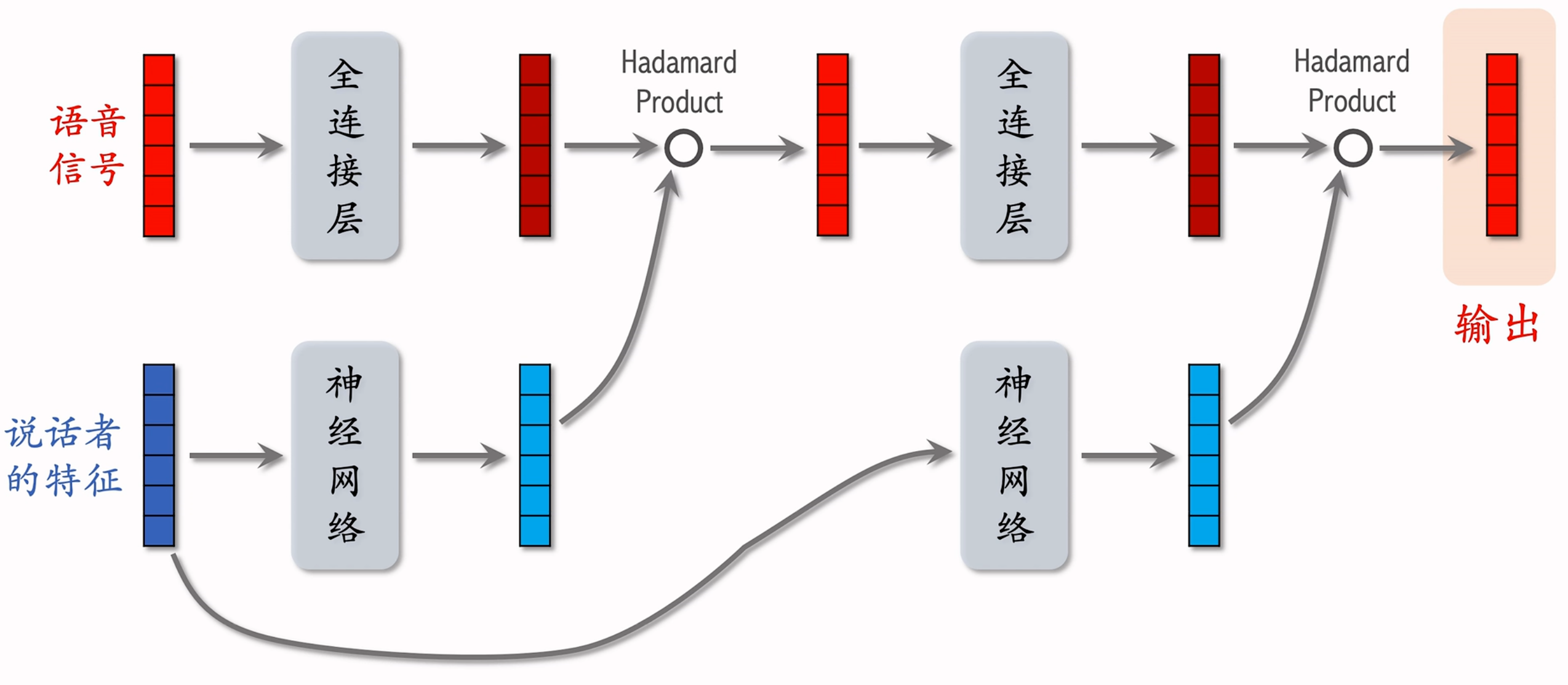 - 图中“神经网络”的结构为多个全连接层+Sigmoid变换后乘以2,这样与语音信号做 Hadamard 乘积时,可以放大或缩小一些特征,实现个性化;